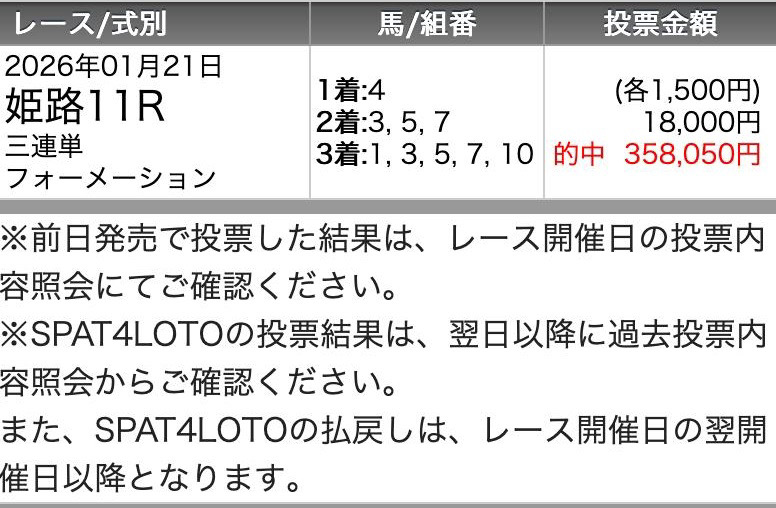 決して高配当とまでは(100万円以上)とはいきませんが 堅実的に10~20万円前後の配当的中してます。 今年、金杯開催週から3週連続で的中しているので明日も楽しみです、この一番新しい的中は27万3490円払い戻しでした。