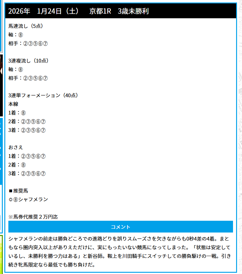 1月の重賞は毎年、金杯からずっと荒れますね、競馬場ではゴール後に悲鳴でしょうが私は歓喜でした。 軸は前評判人気馬だったから個人の予想で買えても、2着、3着と11人気、9人気は絶対に拾えていなかったです。 気持ち的にはもっとオッズ上ってほしかったけど、50万9500円払い戻しは1月から上々のスタートです。 競馬予想サイト使うからにはこれくらいを毎回貰いたいところですね。