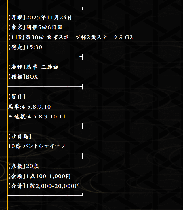 麒麟の無料情報やりますね、馬単&3連複無料予想 第30回東京スポーツ杯2歳ステークスの買い目で10万3千円の的中もらえました。 年末まで鬼のリピート確定です。