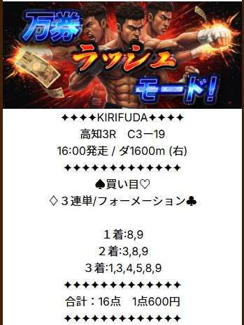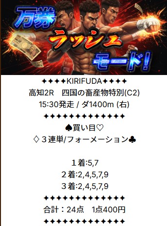 中央では何度かありますが、、、本題ですが高知競馬を3連単フォーメーション(馬券代9,600円)で1391.9倍的中→556,760円払い戻し。